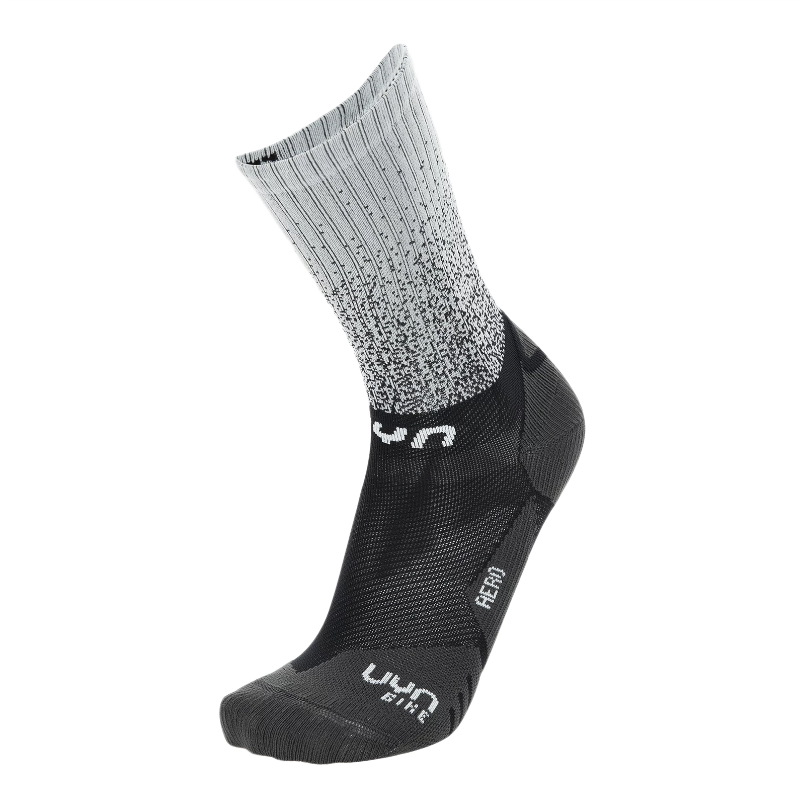 Ľahká váha a aerodynamika sú heslami pre ponožky UYN Cycling Aero. Tento model sa vyznačuje trojrozmernou štruktúrou nohy, ktorá je navrhnutá na zvýšenie aerodynamického koeficientu znížením odporu vzduchu. Ponožka je vyrobená zo špeciálnej priadze Fibresist, ktorá uľahčuje klimatizáciu prúdenia vzduchu a je zvlášť odolná proti oderu. Trojrozmerné mikrokanály integrované do vnútorného povrchu umožňujú cirkuláciu vzduchu okolo chodidla a udržiavajú ho pohodlne v suchu a pri správnej teplote, a to aj pri dlhších jazdách. Vďaka technológii Preshock Shield ponúka ponožka strategickú ochranu najcitlivejších oblastí, ako je achilovka.